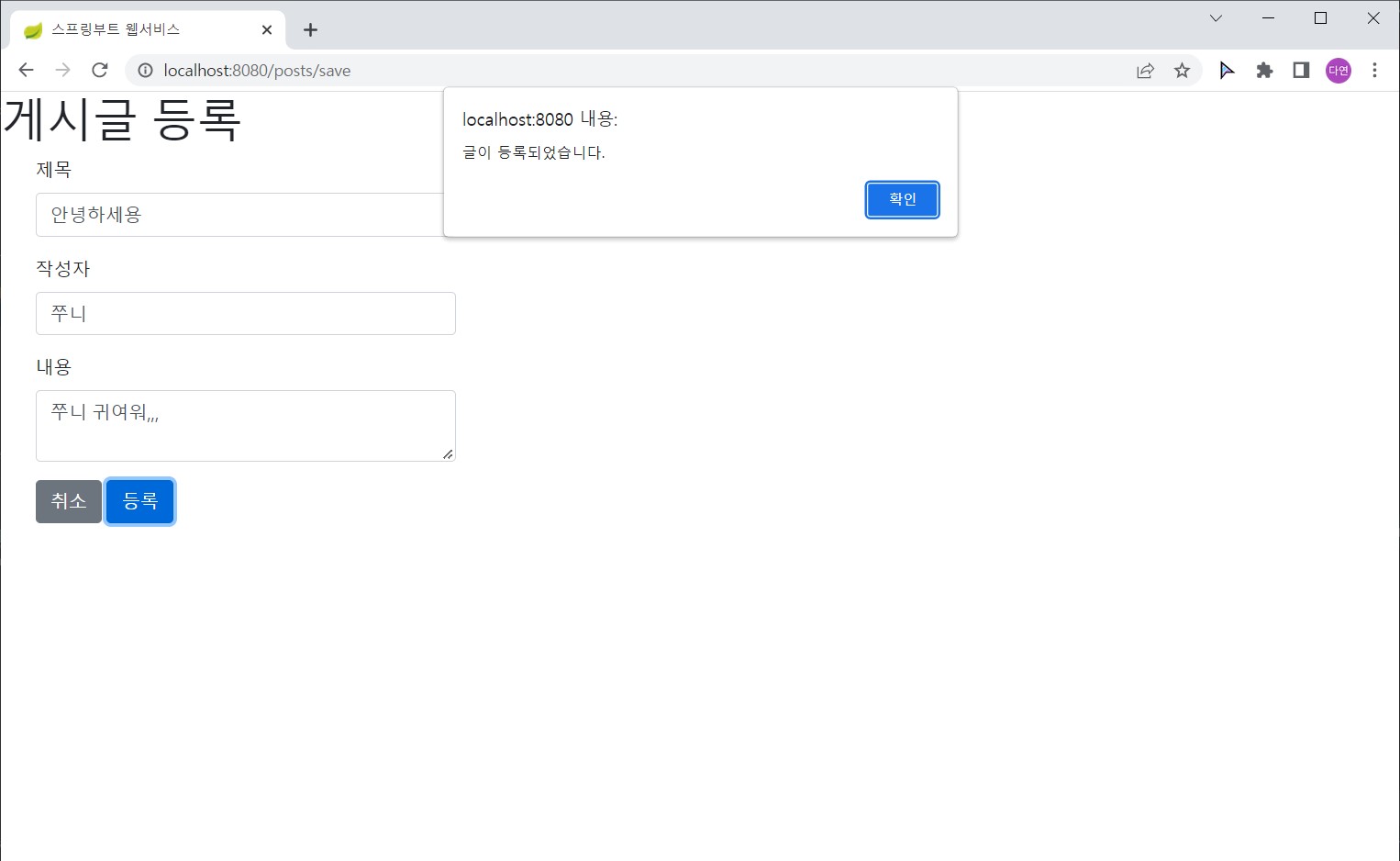 여기까지 작성하고 다시 프로젝트를 실행해보면 아래처럼 글 등록 화면도 완성된다.