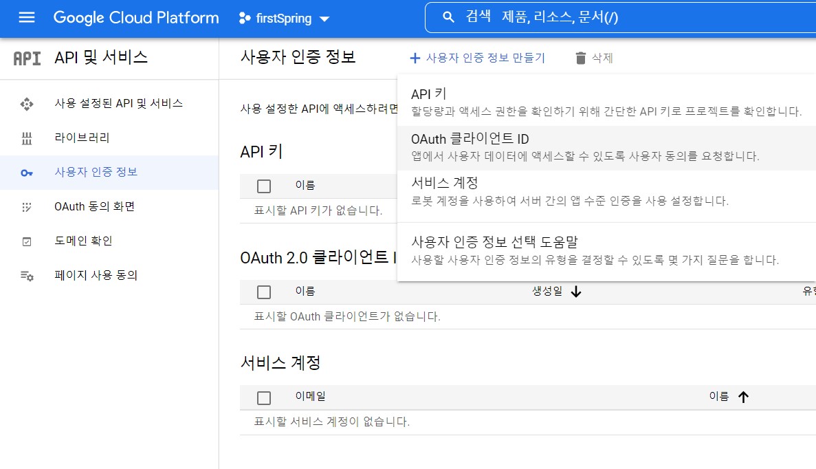 - googleCloudPlatform 사이트에서 프로젝트 등록과 OAuth 인증을 한다.